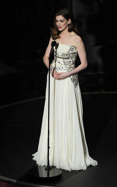 Anne Hathaway’s second look of the night was certainly the best chosen by Rachel Zoe. Her entire wardrobe was stunning, but this Givenchy frock was exceptional. Hathaway looked contemporary and youthful as she glided across stage in this gown.